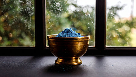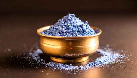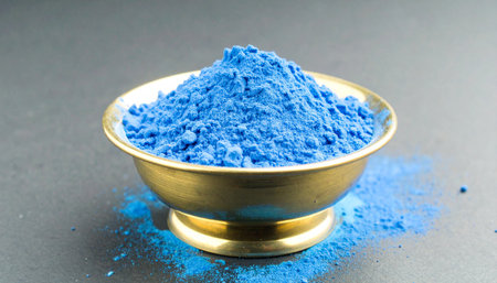 Blue pigment granules. Close-up of vibrant blue powder with spherical granules and hints of bronze dust on a dark background, creating a textured and striking visual.