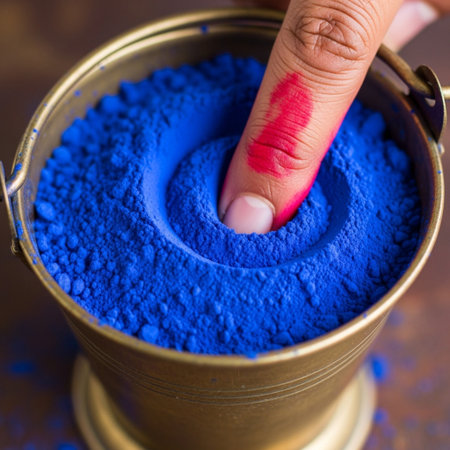 Realistic single small brass bowl filled with vibrant color holi powder placed on matte black surface, minimal festival concept