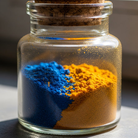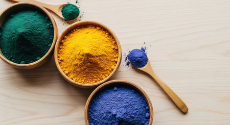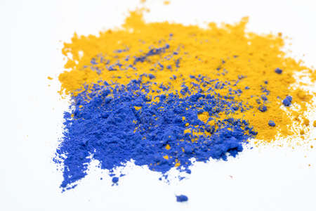 Colorful powders in vivid yellow and blue shades are arranged side by side showcasing their texture and vibrant hues for artistic use.