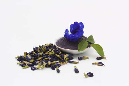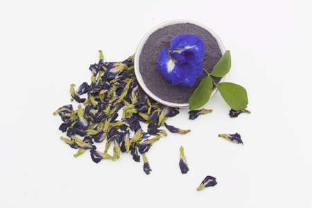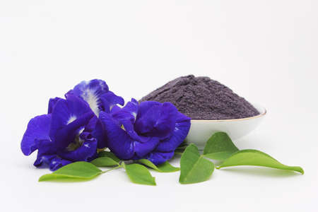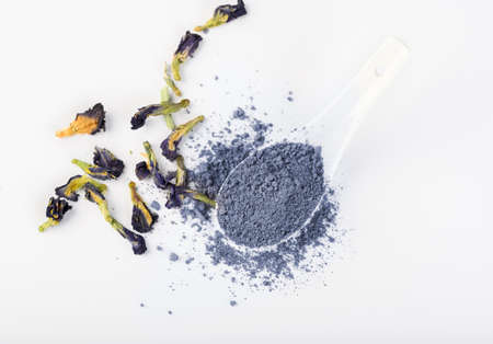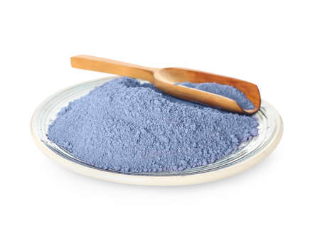 Blue butterfly powder in the plate on white background. Super natural blue food from clitorea ternatea plant. Copyspace for text.