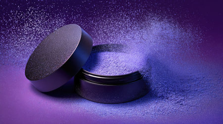A stunning image of bright purple cosmetic powder spilling from an elegant black container, creating an artistic cloud on a vibrant backdrop. Perfect for beauty and fashion projects.