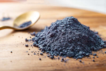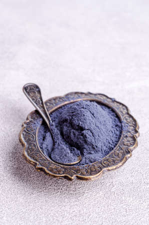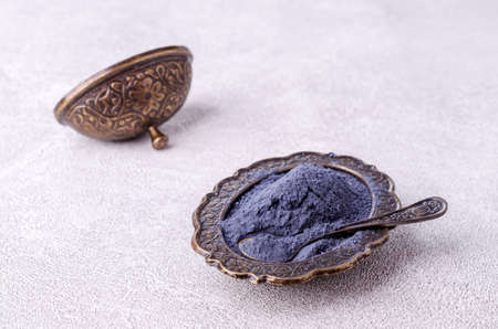 Dry blue powder in a metal bowl. Traditional Japanese tea. selective focus.