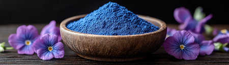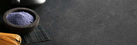 Stone bowl with powdered blue matcha tea on dark background with space for text