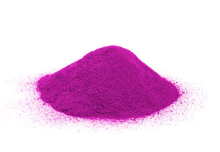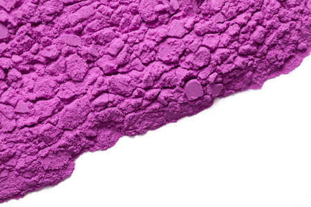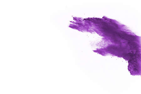 Powder explosion. Closeup of a purple dust particle explosion isolated on white. Abstract background.