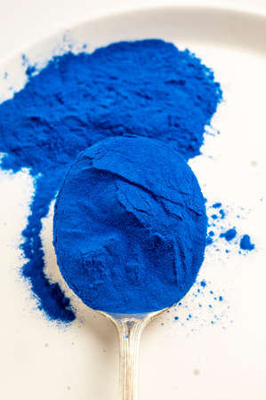 Blue spirulina powder texture on white vertical ackground. Phycocyanin extract. Natural superfood, vegan, healthy dietary supplement.