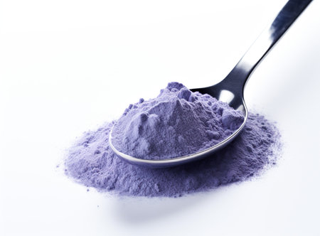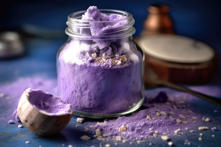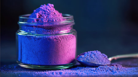 A close-up of vibrant purple powder in a glass jar, enhanced by soft lighting, features a spoon beside it, perfect for art, beauty, or creative projects.