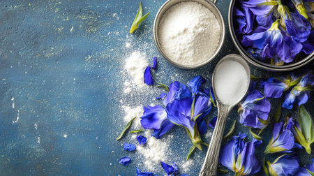 A stunning flatlay featuring vibrant blue edible flowers alongside sugar powder, perfect for culinary creations and decorative uses. Ideal for food styling.