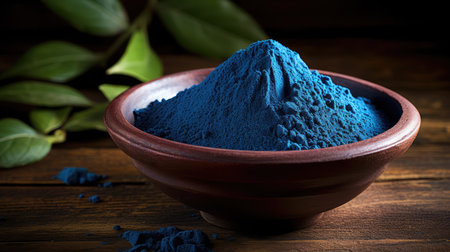 Butterfly pea flower powder or blue matcha in glass bowl. Natural pigment for cooking, detox, cosmetics and personal beauty care. Closeup
