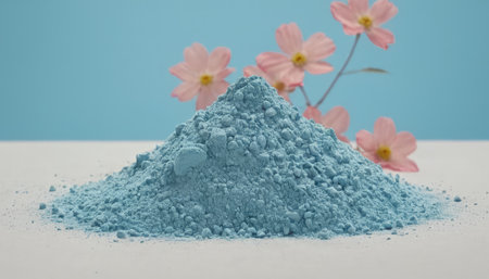 Bold contrast between soft pink pigment and cool blue surface in studio lighting