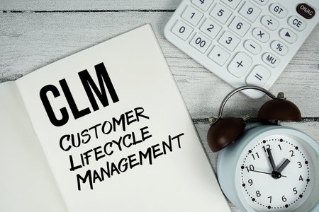 CLM Customer Lifecycle Management text on paper notebook page with alarm clock and calculator on wooden background