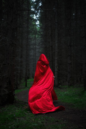 mystic girl in red cloak and hood in forest
