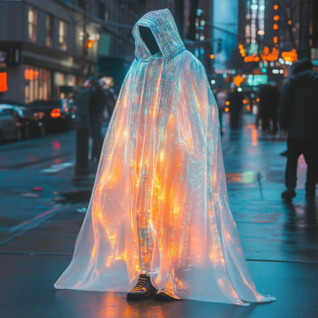 A person wearing a glowing, futuristic suit stands on a busy city street at night, surrounded by neon lights and urban energy, creating a sci-fi and cyberpunk atmosphere.