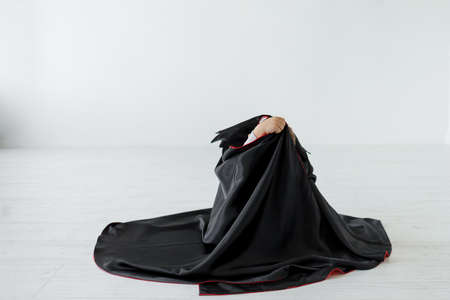 Kids playing concept. Playing boy hiding himself with a black cloak imagining he is a sleeping vampire or invisible man. Halloween mood, creative kids. Poster, promotions, advertising friendly.
