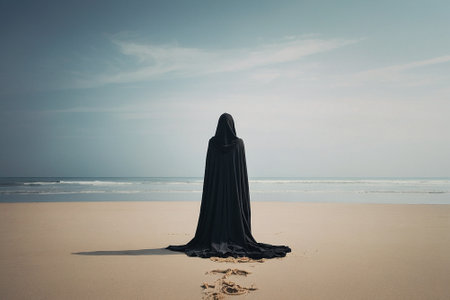 Back view of a woman in black hooded cloak standing on the beach.