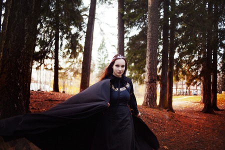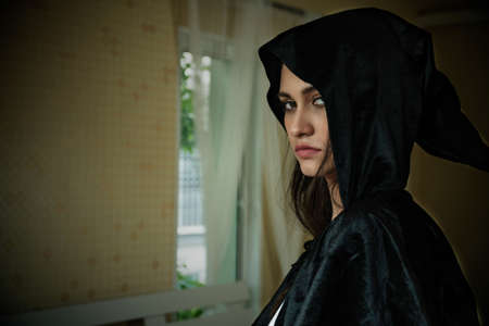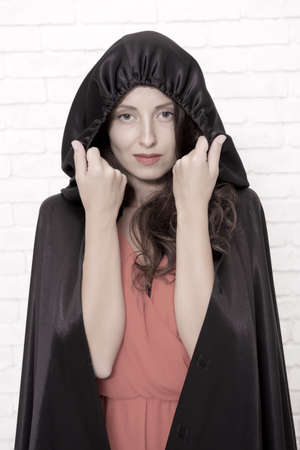 beautiful dark vampire woman with black mantle and hood halloween