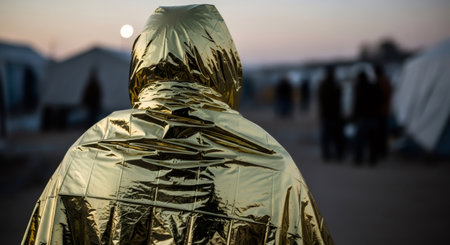 Refugee woman facing away from camera wearing thermal blanket looking at blurred background of camp during cold sunset.