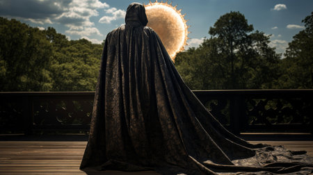 Hooded figure wearing a long, dark cloak stands against a shadowy background, evoking a sense of mystery and intrigue. Ai generated image