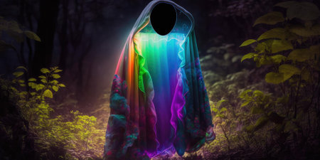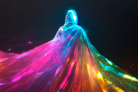 A striking silhouette adorned in an ethereal cloak emits a neon glow, creating a modern and imaginative atmosphere ideal for artistic projects or themes.