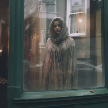 dreamy street photo cute pretty young woman glass window reflection glare glowy sadness