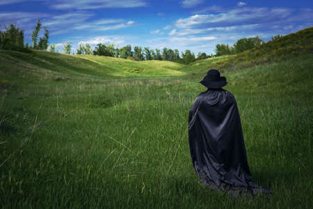 Man in a black cape and hat in the green valley