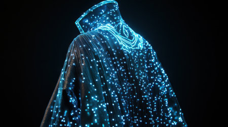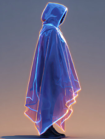 A stunning display of digital art showcases a cloak illuminated by vibrant blue lights, creating a captivating visual effect.
