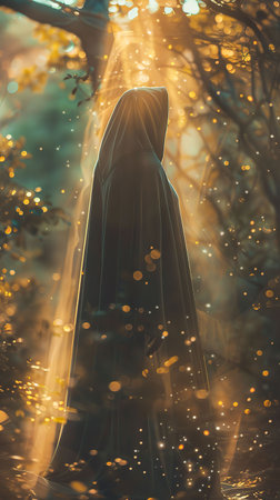 Mysterious figure in dark cloak in enchanted forest