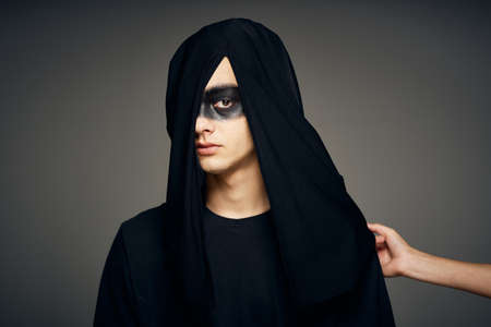 This striking image depicts a mysterious figure cloaked in black with a hood, presenting an expression of anonymity and evoking a sense of intrigue and fear.