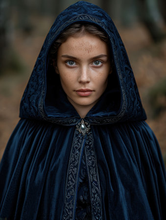 Mysterious woman in dark hooded cloak