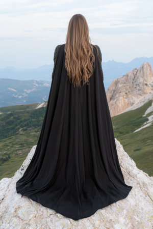Woman in black cape sits on mountain top overlooking valley