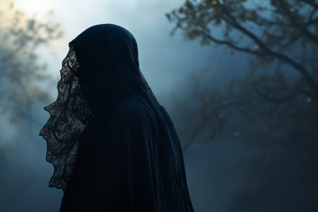 Mysterious figure in black cloak against blurred background