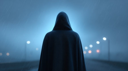 A mysterious cloaked figure stands alone in a foggy night landscape, illuminated by soft streetlights and enveloped in the serene ambiance of rain.