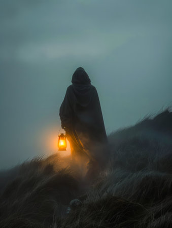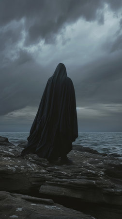 Hooded figure on rocky shore during stormy weather, mysterious and ominous atmosphere concept