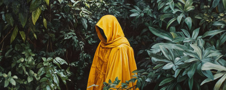 Mysterious figure in yellow cloak surrounded by lush green foliage