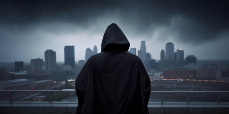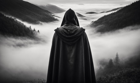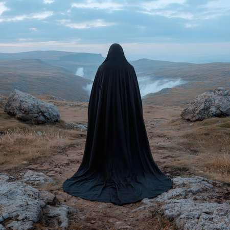Mysterious figure in black robe overlooking a vast landscape