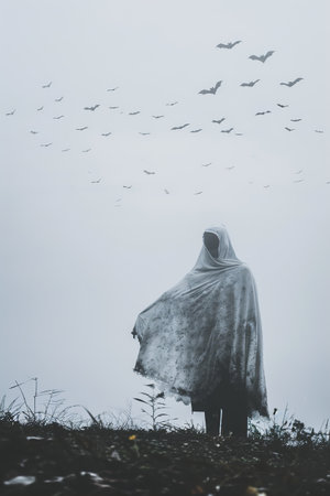Solitary figure draped in a ghostly white shroud, standing ominously against a foggy backdrop with a swarm of bats flying above. Ideal for setting a spooky Halloween mood. Generative AI.