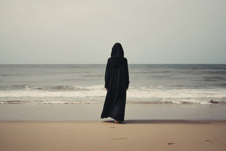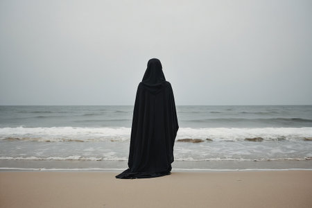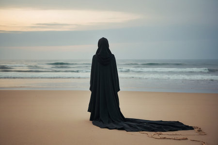 Woman in a black niqab standing on the beach and looking at the sea