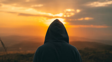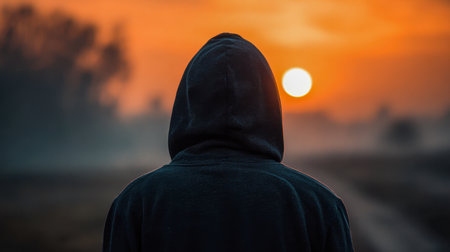 A solitary figure in a shadowy hoodie gazes into the hazy horizon, enveloped by the warm glow of twilight, evoking introspection amid nature?s moody backdrop.