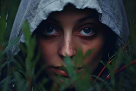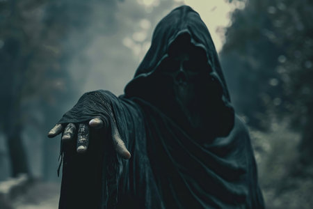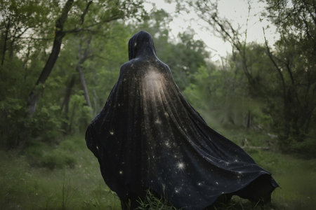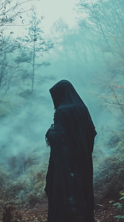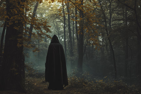 Mysterious hooded figure in dark forest