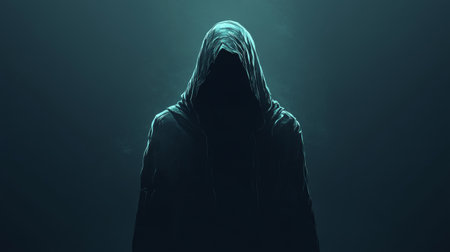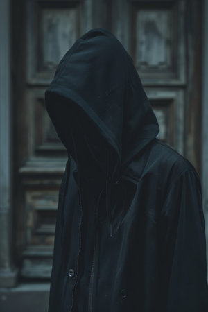 Hooded figure emerging from darkness with backlight creating mysterious atmosphere