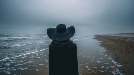Man in black cloak standing on the beach and looking at the sea