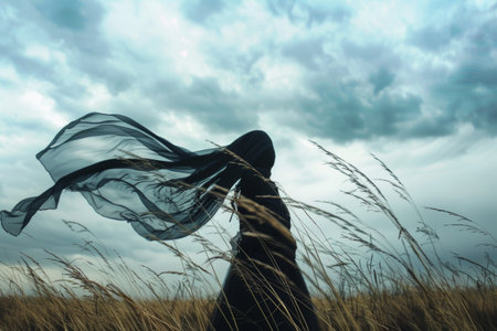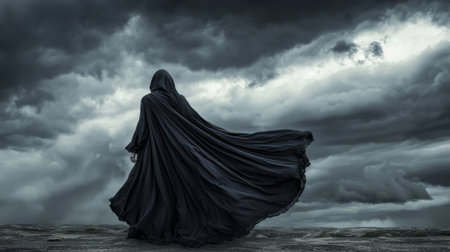 Mysterious gothic woman with flowing black cloak standing under a stormy sky. Generative AI