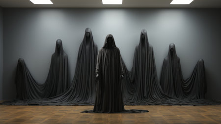 Faces are not visible in black robes in the dark on a black background. Banner.