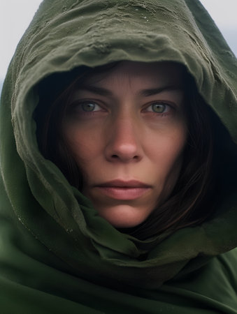 Portrait of a beautiful woman in a green coat with a hood