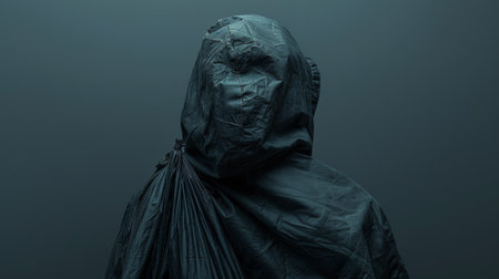 A gloomy man in dark clothes, a black hood on his head, a gas mask protects his face.
