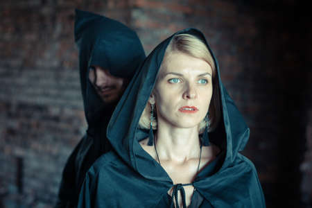 Young woman in a hood on a background of green grass. Halloween.