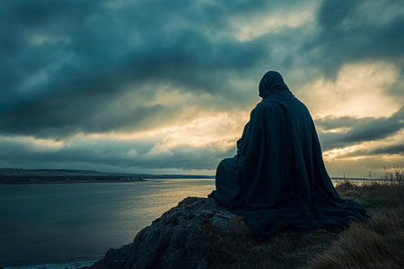 A cloaked figure sits quietly on a rocky ledge, gazing contemplatively at the tranquil waters. The clouds gather above, casting a moody hue as twilight approaches, blending earth and sky.