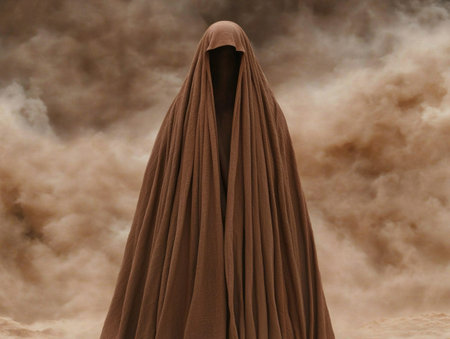 Mysterious figure in brown cloak against cloudy sky