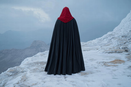 Mysterious figure in red cloak standing in snowy landscape