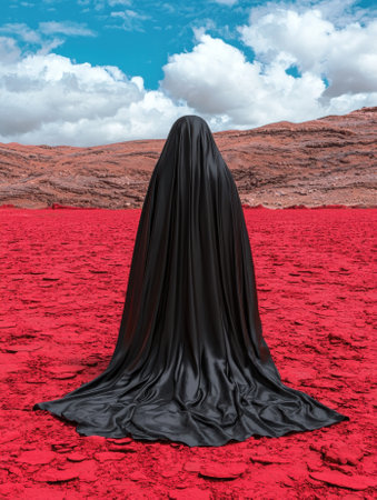 Figure in black fabric standing in a desolate landscape.