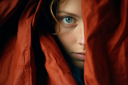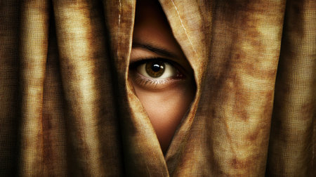 A closeup of a single eye peering through a curtain, evoking mystery and emotion. Soft lighting enhances the textures and shadows, creating an intimate atmosphere.